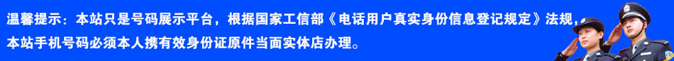 本站承诺: 1、 本网所售手机号码都是正规渠道货源,套餐资费标准和对应运营商官方发布的信息一致! 2、 如果发生号码已售出、须转户但无法完成转户等无法完成交易的情况,客户可以重新选号或者取消订单,无须支付任何费用! 本站不承诺: (由于号码池无法时时同步更新!个别号码售出后未能及时下架……) 1、 不能确保本站所有出售中的号码都有效、未出售、可以出售 2、 在任何交易环节都不能确保交易一定能成功
